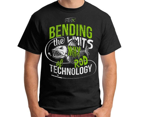 Stylish MHX ‘Bending the Limits’ t-shirt with fish skeleton. Hanes 100% cotton BEEFY-T crew neck t-shirt, black with graphics on chest.
